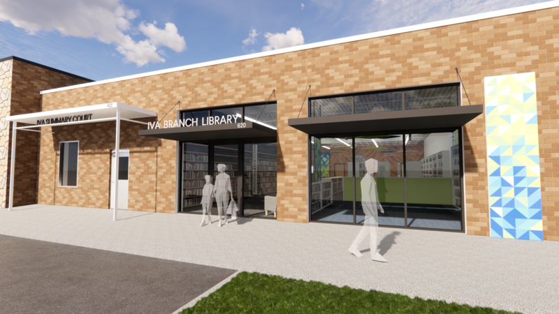 Renderings of the New Iva Branch Library, set to open in the former Iva Fire Department Building in the town square.